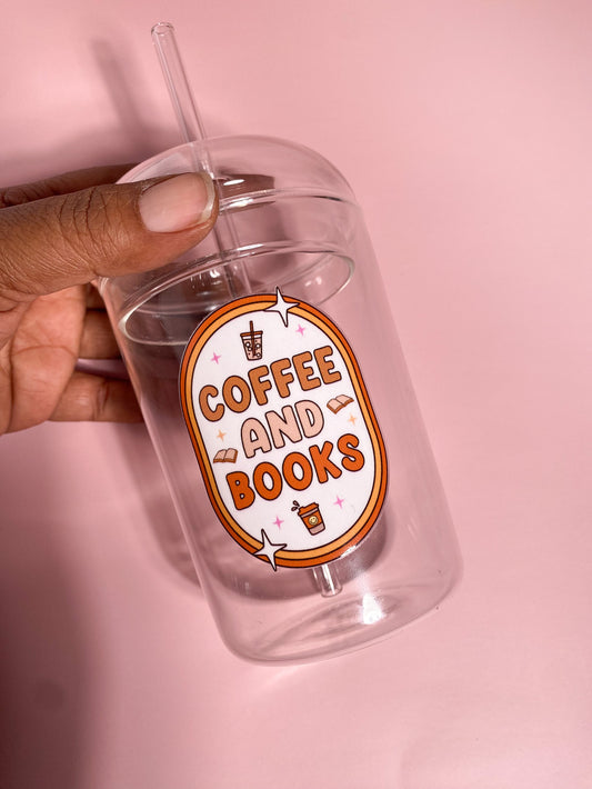 Coffee & Books Glass Cup with Dome Lid and Straw